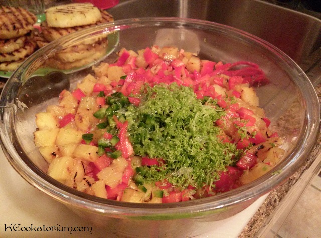 Once all the pineapple is grilled, chop the pineapple into small bite-size pieces–about 1/2″ cubes.  Add in remaining veggies, cilantro, lime juice and zest.