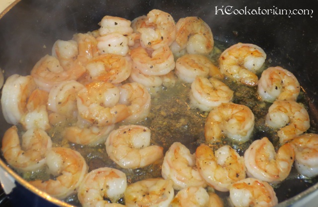 Depending on what kind of shrimp you find, you’ll want to make sure they are deveined, and shelled.  Set aside.  In a deep saute pan, melt butter and oil.  Toss in minced garlic, cook just until you can smell it, then toss in the shrimp, sprinkle with salt and pepper.