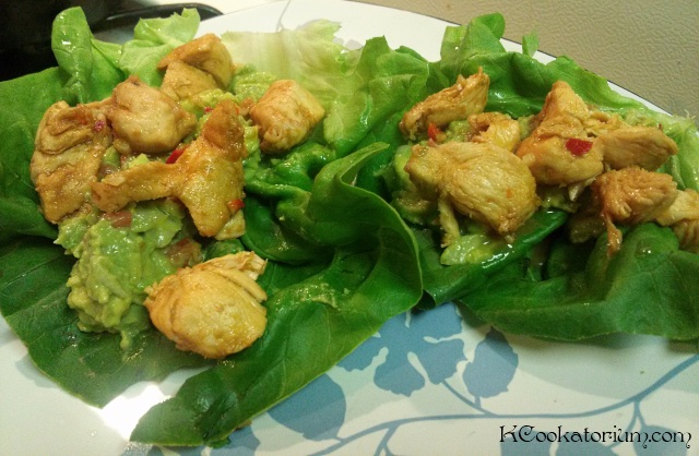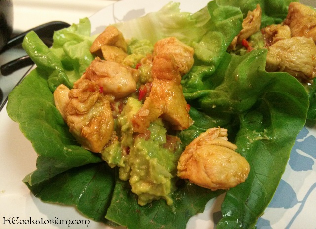To serve, wash individual lettuce leaves, set on a plate, and scoop a small amount of guacamole onto the leaf. Put one or two pieces of chicken on the guacamole and enjoy! You can eat this similar to a taco or lettuce wrap, but be warned if you got REALLY excited with the guacamole like I did, you may need a napkin or 5…and a fork and knife.