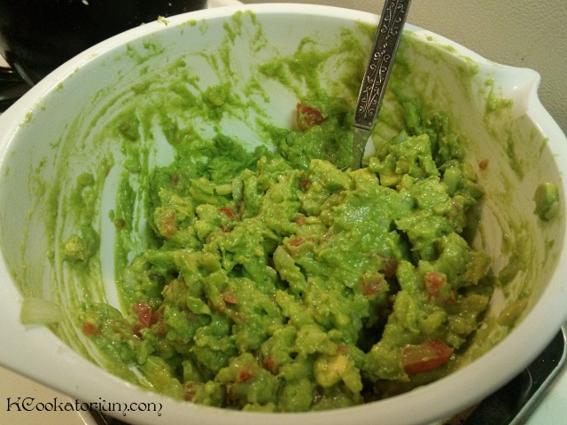 For the Guacamole, mash your avocado with a fork until only subtle chunks remain. (If you prefer your guacamole creamy, then mash it all the way.) Cut and dice your tomatoes and onions, add to mashed avocado. Mix with garlic salt, lime juice and cilantro, and set aside.