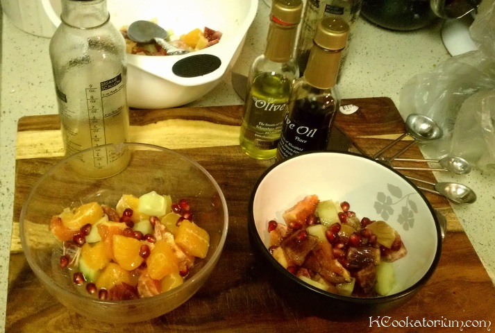 Now, you’re thinking (at least, I was) cucumbers and oranges…  Sounds good..but a little boring.  Need something crunchy…Celery?  Naw, too bitter.  Nuts?  Possibly, but not where I was going.  pomegranates?  YES!  DING DING DING!!  Then I felt, maybe the fancy-shmancy tangerine balsamic vinegar I bought the other day might work…so…TASTE TEST!!